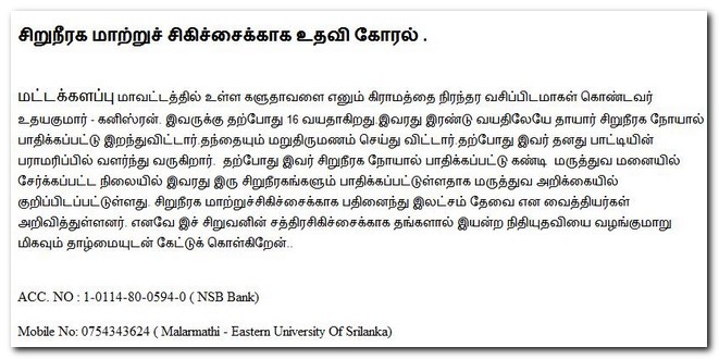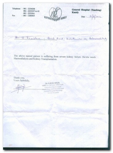 Mr.U.Kanistan(Kaluthavalai) needs Haemodialysis and Kidney Transplantation(attachment by Malarmathi-Eastern University)