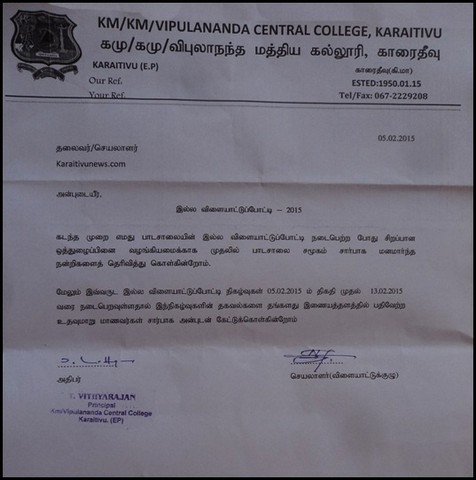Karaitivu Vipulananda Central College Inter House Sports Meet starts on 05/02/2015 and finishes on 13/02/2015(attachment)