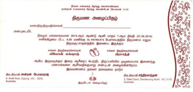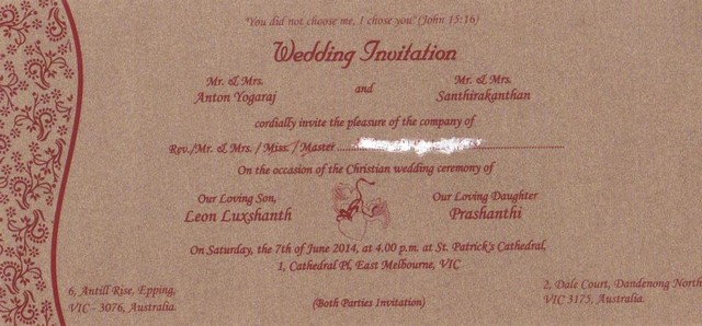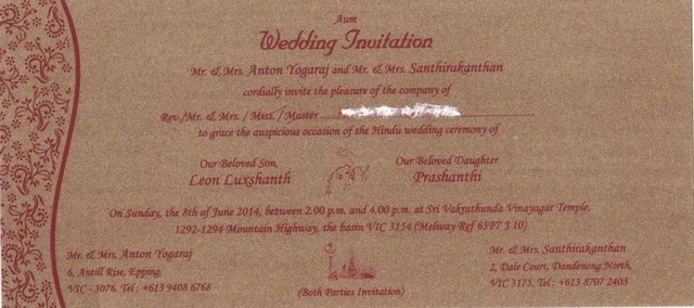 Late V.T.Sellathrai(Ret.Principal) & Late Arudsivam(A.G.A)'s grand daughter & Kanthan Vadiva's daughter Prashanthi marries Mr&Mrs.Anton Yogaraj's son Leon Luxshanth on Saturday 07/06/2014(Christian wedding) & Sunday 08/06/2014(Hindu wedding) in Australia(attachment)
