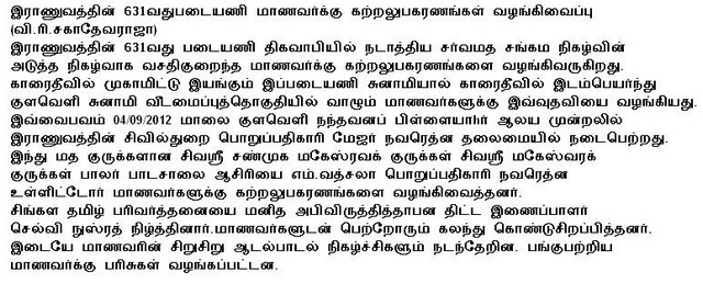 Srilankan Army's 631st Unit of Karaitivu donated studying accessories to the "Kulaveli" Tsunami housing scheme students at Karaitivu on 04/09/2013(Photos)