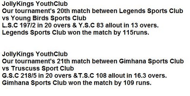 Jolly Kings Sports Club T-20 Cricket Tournament's 20th & 21st match results & Photos