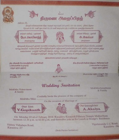 Mr&Mrs.Yogaretnam Parameswary's son "Gopikanth" marries Mr&Mrs.Annathurai Annaledsumy's daughter & Subramaniyam akka's grand daughter "Akalya" on 03/02/2014(attachment)
