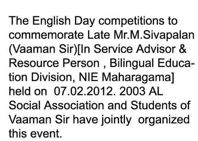 The English Day competitions to commemorate Late Mr.M.Sivapalan (Vaaman Sir)[In Service Advisor & Resource Person , Bilingual Education Division, NIE Maharagama] held on 07.02.2012. 2003 AL Social Association and Students of Vaaman Sir have jointly organized this event.