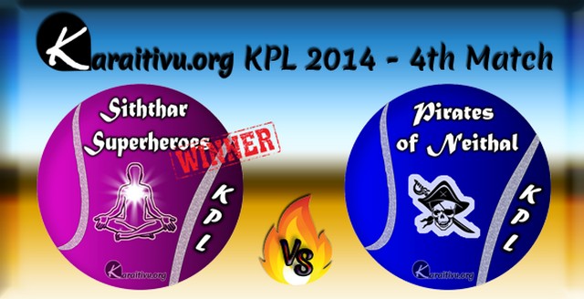KPL 4th match results:Pirates Of Neithal captain won the toss and elected to field against Siththar SuperheroesSiththar Superheroes - 88 runs for 3 wicket in 5 overs.Pirates Of Neithal - 65 runs for 5 wickets in 4.5 overs.Siththar Superheroes won by 23 runs(Photos)