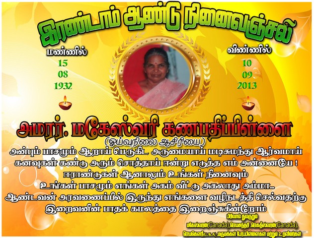 Late Maheswary Kanapathipillai's(Saana Kaana)'s Second death anniversary on 10/09/2015(Photo)