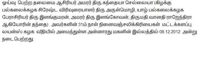 Retired Head Master Late Mr.Kanthaiyah Sellaiyah's Alms giving ceremony(Photos by Gopinaath
