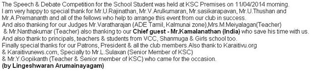 The Speech & Debate Competition for the School Student was held at KSC Premises on 11/04/2014 morning(Photos from karaitivu.org)