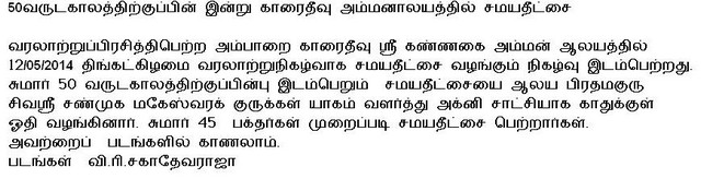 "Samaya Theedchai" after 50 years at Karaitivu Kannakai Amman temple(Photos)