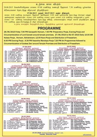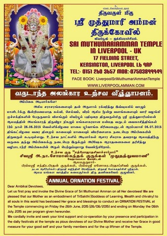 Liverpool(U.K) Sri Muththumariamman temple annual Ornation festival starts on 26/06/2015 and finishes on 06/07/2015(attachment)