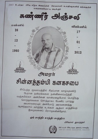 Mathiyalakan's father "Sinnathamby Kanagasabai" passed away on 17/01/2012(Vishnu Vidyalayam cross road)(Photos)