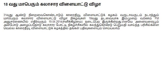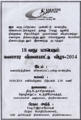 K.S.C & V.C.C's 18th Annual Cultural Sports meet will be on 19th April & Live Telecast from Karaitivu.org(attachment)