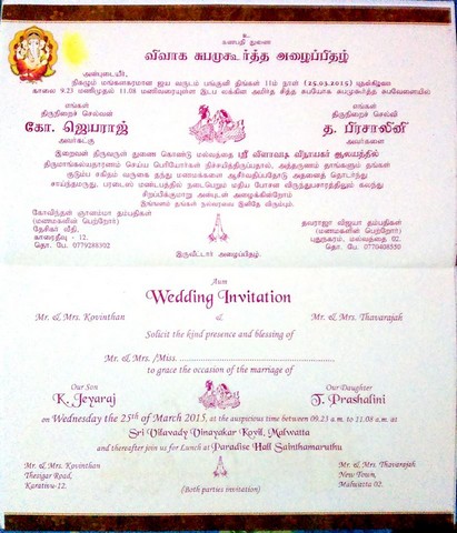 Mr&Mrs.Kovinthan Ganamma's son Jeyaraj(Karaitivu-12) marries Mr&Mrs.Thavarajah Vijaya's daughter Prashalini(Malwaththai-02) on 25/03/2015(attachment)