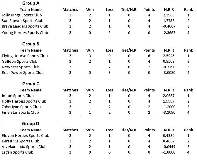 அமரர் கைலாயபிள்ளை கிருபேந்திரா ஞாபகார்த்த கடினபந்து கிரிகட் சுற்றுப்போட்டியின் அனைத்து குழுநிலை போட்டிகளும் சிறப்பாக நிறைவு பெற்றுள்ள வேளையில் காரைதீவு விளையாட்டுக்கழகத்தின் சுற்றுப்போட்டி ஏற்பாட்டுக்குழுவினால் ஊடகங்களுக்கு வெளியிடப்பட்டுள்ள விபரங்கள் வருமாறு சுற்றுப்போட்டியில் அணிகள் கலந்து கொண்ட A,B,C ஆகிய குழுக்களில் நிகர ஓட்ட விகித அடிப்படையில் குழுநிலையில் 1ம்,2ம் நிலைகளைப்பெற்ற அணிகள் கால் இறுதி ஆட்டத்துக்கு தெரிவு செய்யப்பட்டுள்ள அதேவேளை குழு D இல் நிகர ஓட்ட விகித அடிப்படையில் முதல் நிலையில் உள்ள Eleven Heroes அணியும், போட்டி ஒன்றின்போது இடம்பெற்ற தவறான கருத்துப்பரிமாறறம் காரணமாக சுற்றுப்போட்டி ஏற்பாட்டுக் அணியான காரைதீவு விளையாட்டுக்கழகம் குழுநிலையில் 2ம் நிலையில் இருந்தும், குழுநிலையில் 3ம் நிலையிலுள்ள காரைதீவு விவேகாநந்தா விளையாட்டுக்கழகத்தை முழு மனதுடன் அனுமதித்ததன் காரணமாக குழு D இல் விவேகாநந்தா விளையாட்டுக்கழகம் இரண்டாவது அணியாக கால் இறுதி ஆட்டத்துக்கு தெரிவாகியுள்ளது. இம்முடிவை ஆதரித்த எமது கழக வீரர்களுக்கும், கழக உறுப்பினர்களுக்கும், கழக அபிமானிகள் மற்றும் நலன்விரும்பிகளுக்கும் கழகத்தின் சார்பில் நன்றிகளை தெரிவித்துக் கொள்கின்றோம். தகவல், தலைவர்,செயலாளர் காரைதீவு விளையாட்டுக்ழகம் விபுலாநந்தா சனசமூக நிலையம்