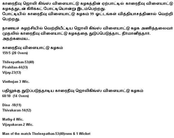Cricket match between K.S.C & Jolly Kings Sports Club was held on 17/01/2015.K.S.C. won by 99runs.(Photos)
