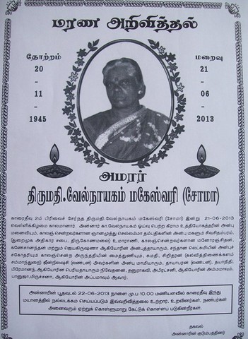 K.V.S.Velnayagam(Singer)'s wife "Maheswary(Soma)" passed away on 21/06/2013(Karaitivu-02)-attachment