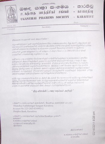 Uganthai Pilgrims Society of Karaitivu has started the expansion of Pilgrims Hall at Uganthai. Please help financially to finish this construction (attachment)