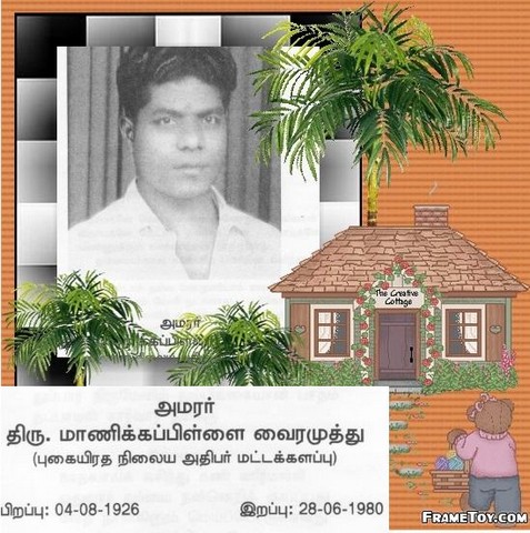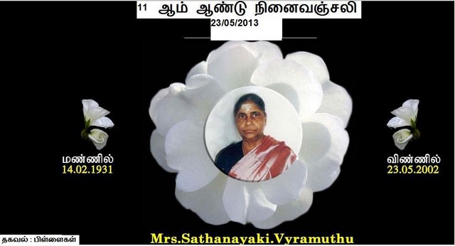 Late Maanikkapillai Vyramuththu's(Railway Station Master,Batticaloa) 33rd Death anniversary on 28/06/2013 and his wife Late Sathanayaki Vyramuththu's(Sathakka) 11th death anniversary on 23/05/2013(Info & Photos by Children)